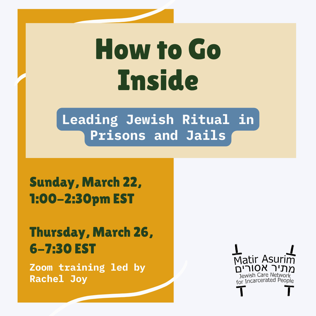 Description: Join Matir Asurim for an informational session on leading Jewish ritual inside jails and prisons. This event will cover ways to connect with your local jail or prison, what to know before going inside, and how to lead ritual in a culturally responsive way with people who are incarcerated.